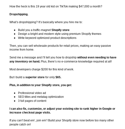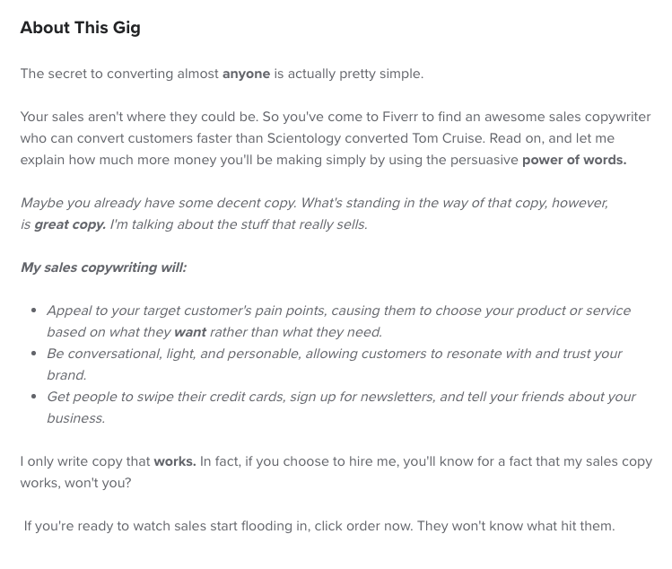 My Fiverr gig for sales copywriting. See below how I use sales copywriting to sell my sales copywriting. (I apologize if you’re a robot and this fairly simple paradox has caused you to malfunction and self-destruct)