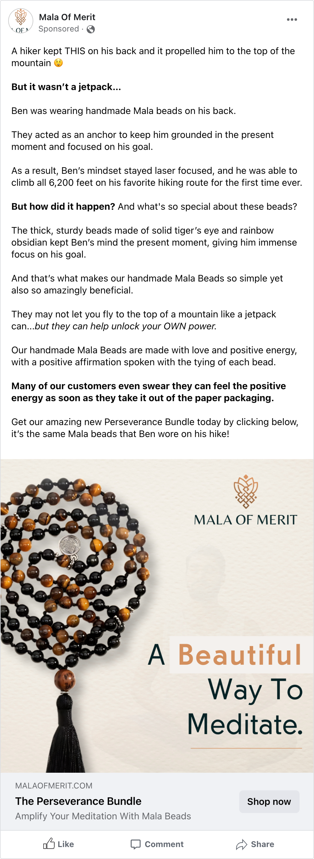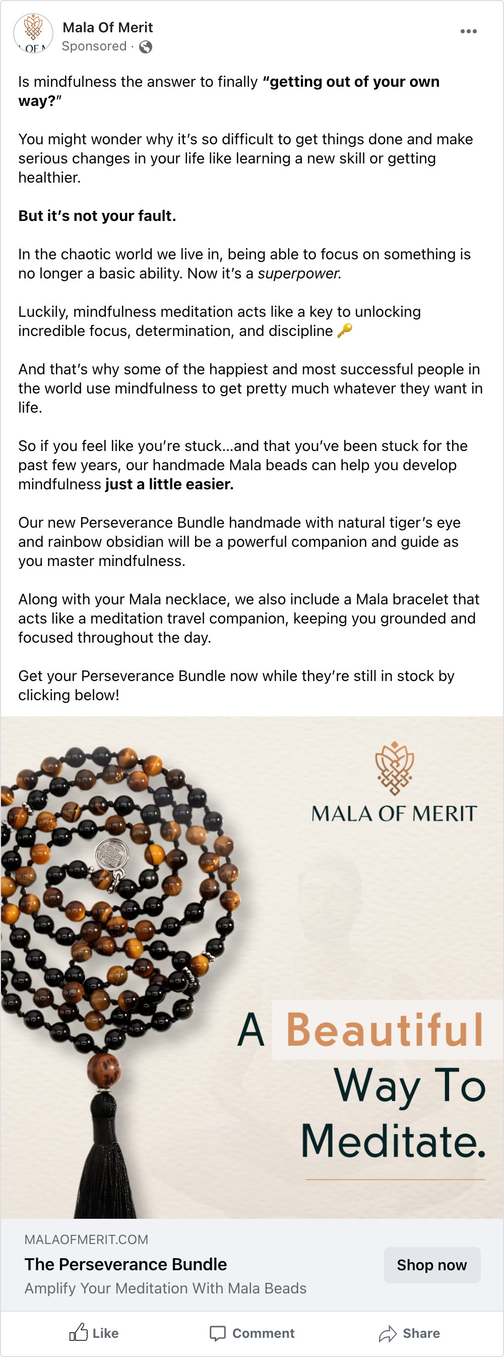 It encapsulates the extremely fine quality and solidity of the beads, as well as how it enhances the meditation experience. So, if it ain’t broke, don’t fix it. That’s what became the headline in the ad image below.